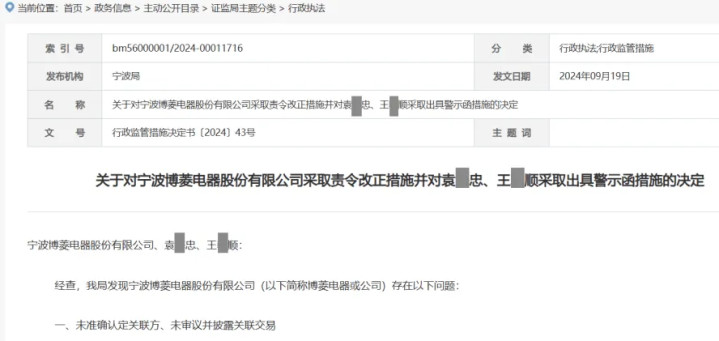2024年9月12日,中国证监会宁波监管局发布行政监管措施决定书,直指博菱电器存在未准确认定关联方、未规范审议披露关联交易、向供应商提供借款时会计核算不规范及信息披露失准等问题。作为博菱电器的实际控制人兼总经理,袁某忠因未忠实勤勉履行职责,对上述违规行为负有主要责任,最终被采取出具警示函的监督管理措施,相关记录被记入证券期货市场诚信档案。仅一个月后,全国股转公司挂牌公司管理一部亦对袁海忠发出口头警示的自律监管措施,进一步凸显其履职中的疏漏。