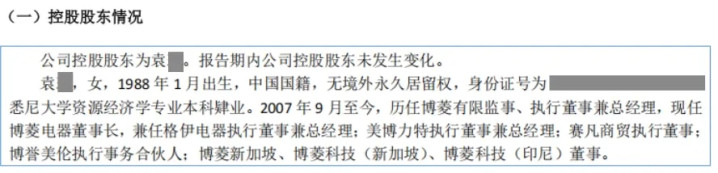 值得注意的是,袁某忠的家族成员在其商业版图中同样占据重要位置,其中女儿袁某的履历尤为引人关注。据博菱电器2024年年度报告披露,袁某出生于1988年1月,悉尼大学资源经济学专业本科肄业,然而,袁某的职业起点却相当早——2007年9月,年仅19岁便加入博菱电器,历任博菱电器监事、执行董事兼总经理,现任博菱电器董事长。